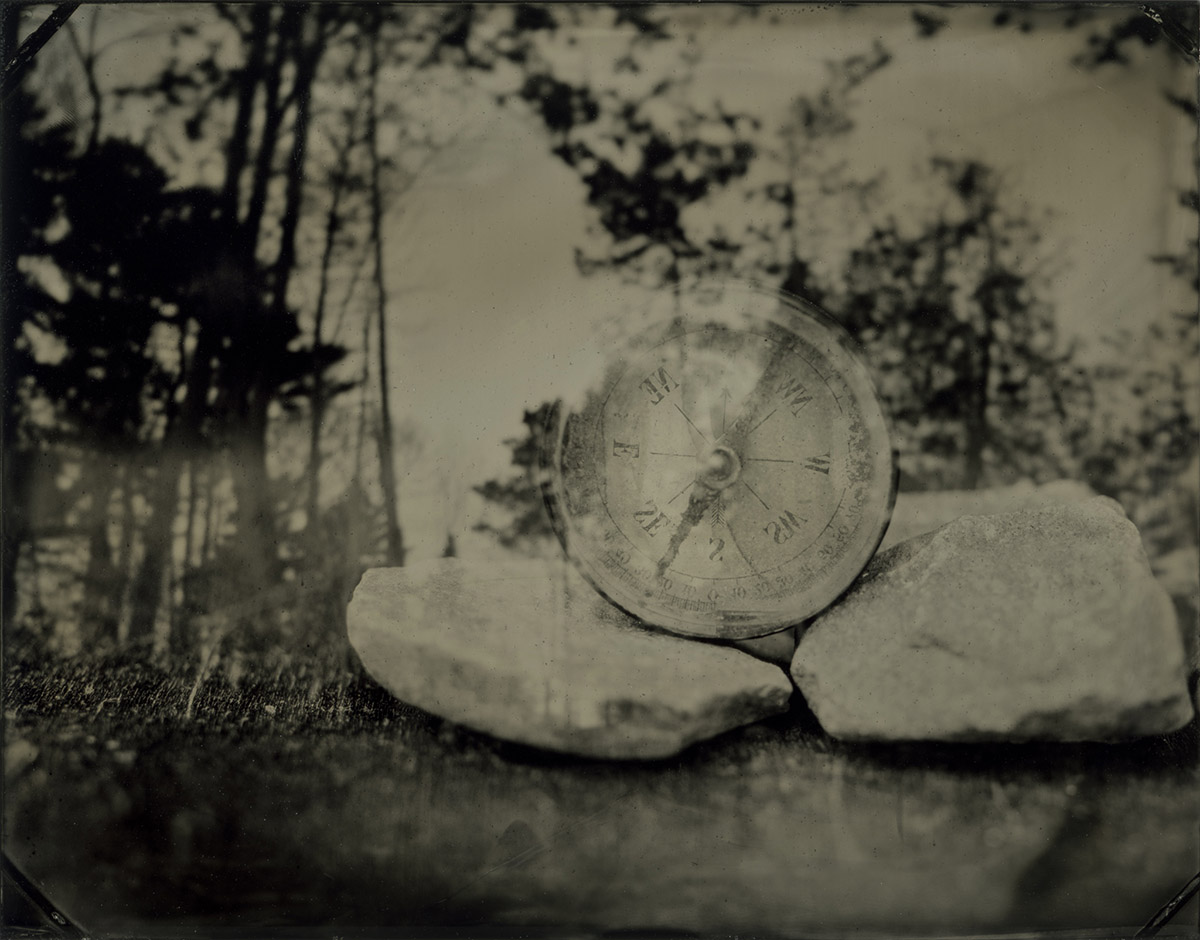 …mostly. After our first plate, which turned out well enough, we did make a couple more to fine-tune how the objects Kari selected (the compass and stones) were rendered against the light and dark areas of my out-of-focus trees in the background.