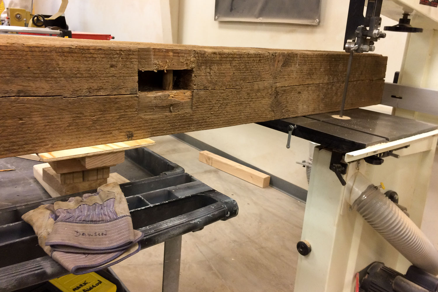 I left the pine beam exactly as I found it, aside from squaring off the ends and sanding them smooth. On one side there is a hole, with an old wooden peg, that used to form a joint in whatever structure this came from. I do sometimes give the wood beams a quick blast in the sandblasting cabinet – gives them a certain texture, as well as removing dirt and loose bits.