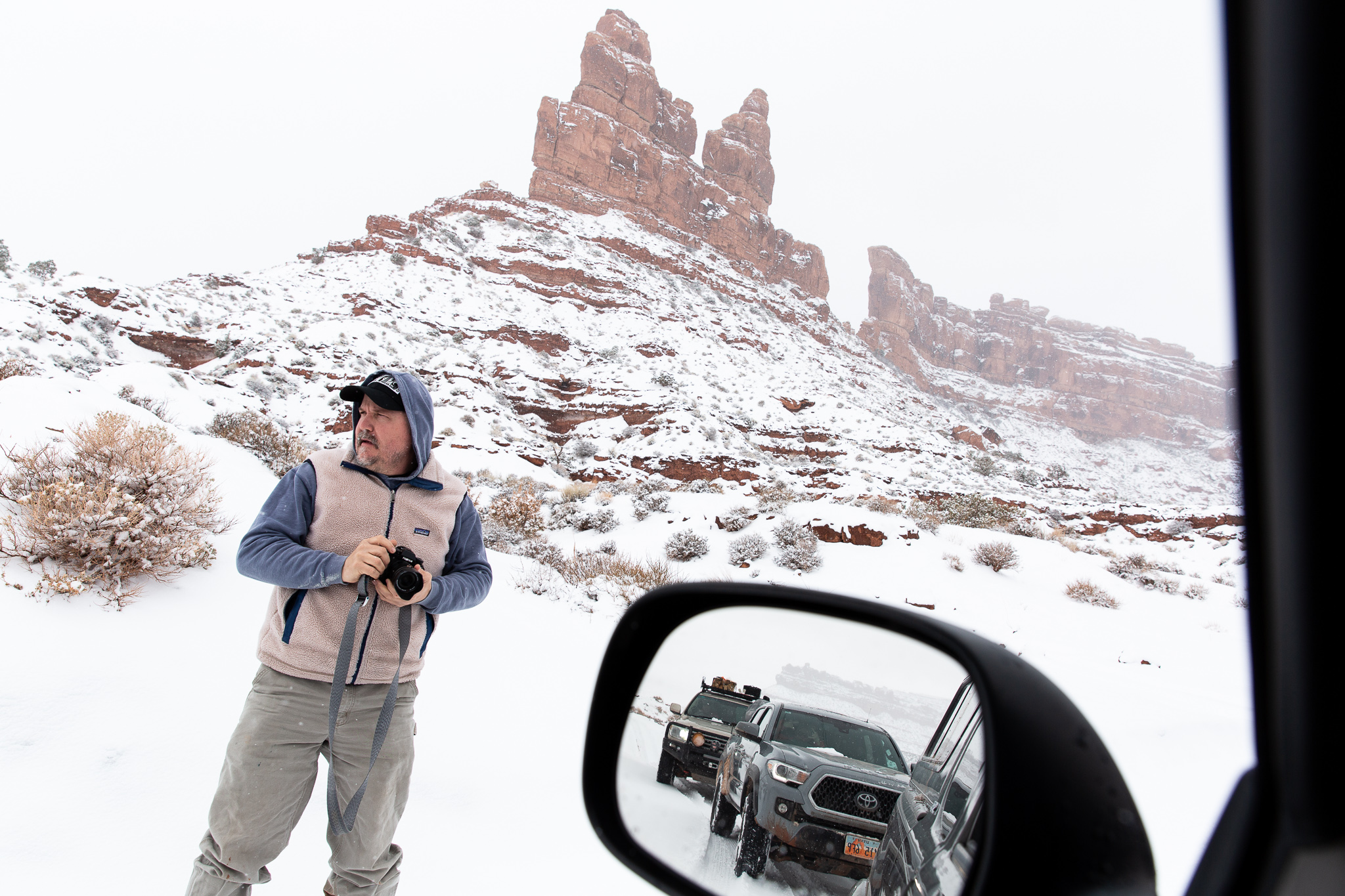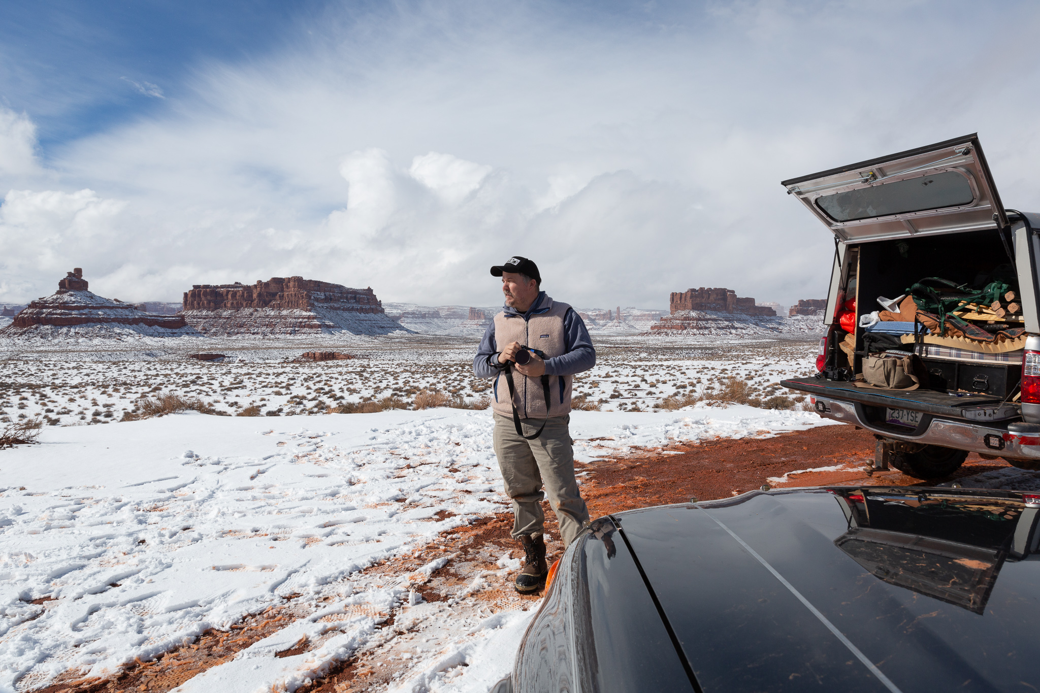 Monday we thought we’d try to get through Valley of the Gods in a snowstorm. I’d been over the road several times, including at least once in a little Ford hatchback, so I was fairly confident the road was fine, but this weekend was my first driving a rear-wheel / 4WD truck in the snow, so I wasn’t sure how it would go. Turns out: pretty awesome!